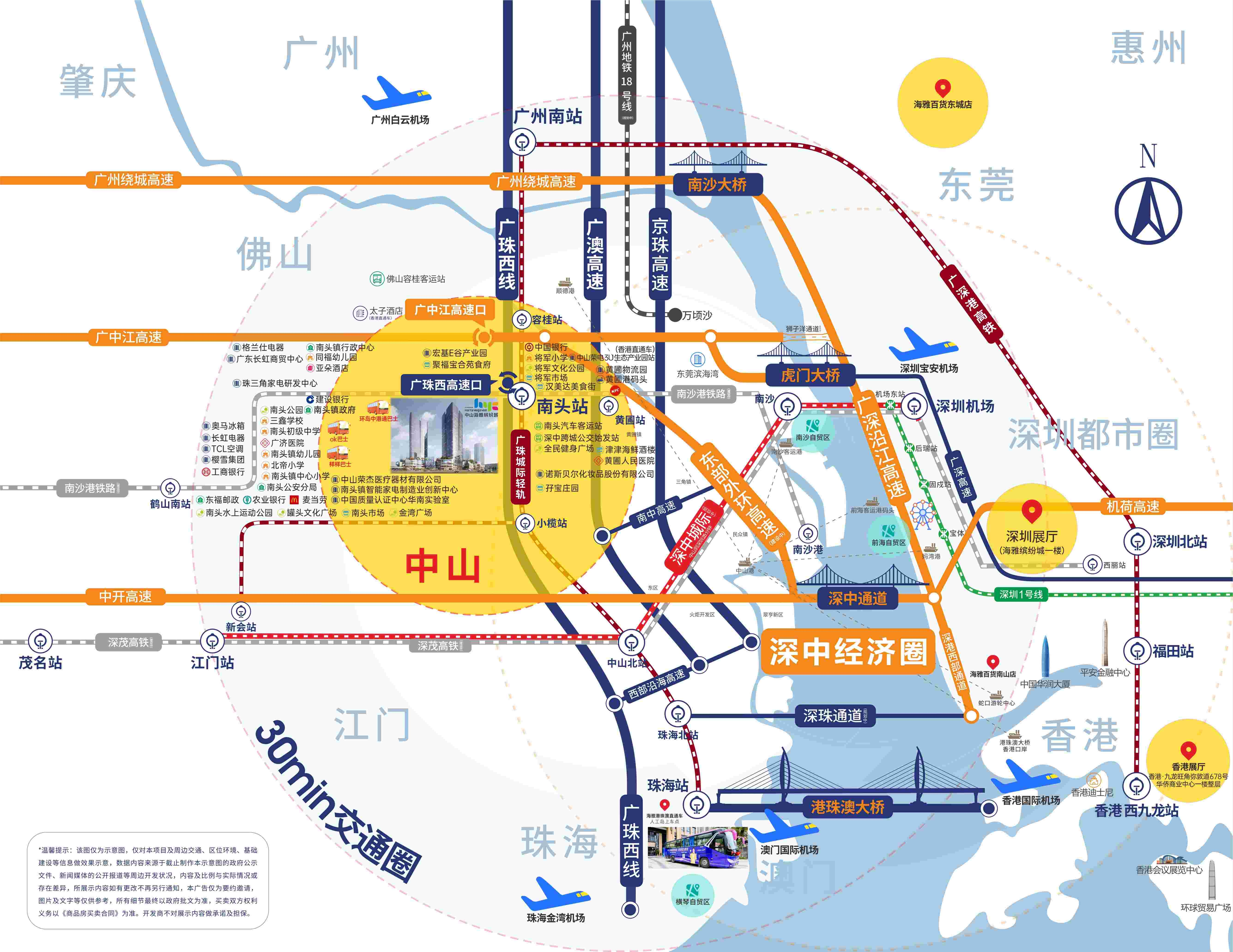理由二:一橋通深中 20分鐘深中同城都市圈 雙線樓巴直達香港,港珠澳直通巴票價25元,深圳口岸直通巴35元。專案直連廣珠城軌南頭站,真正“輕軌上蓋”物業,1站廣州南、3站香港西九龍,1小時通達灣區各主要城市。