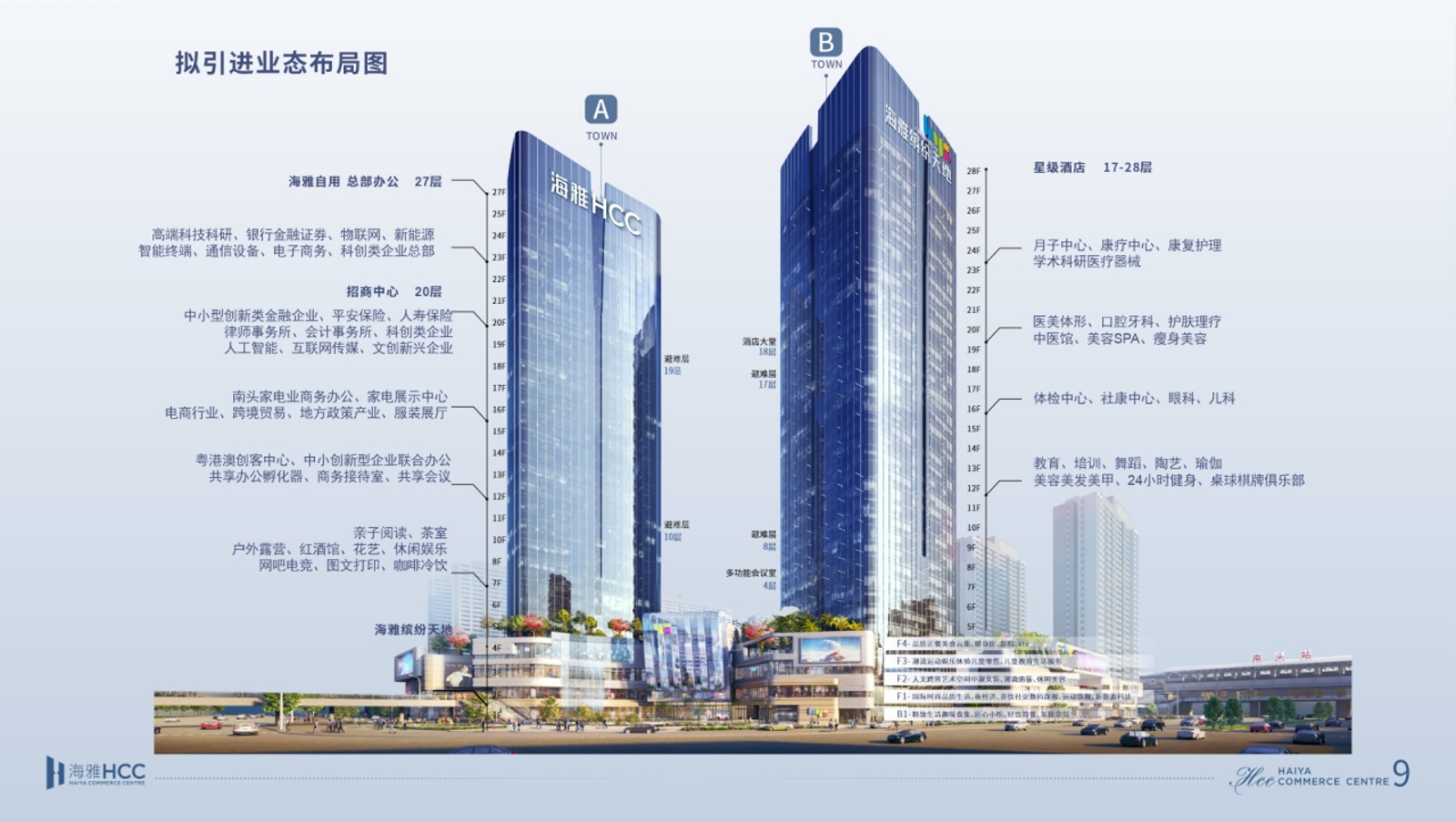 重磅配套2:灣區商務封面 海雅“雙子塔”甲級寫字樓海雅國際創客中心由兩棟寫字樓構成,總建面超過11.5萬平方米,均以超一流水準打造。A塔高146米,共27層,規劃設計為廣東省家電中心和粵港澳青年創業基地;B塔高146米,共28層,規劃為總部企業基地、五星級酒店及相關酒店配套。