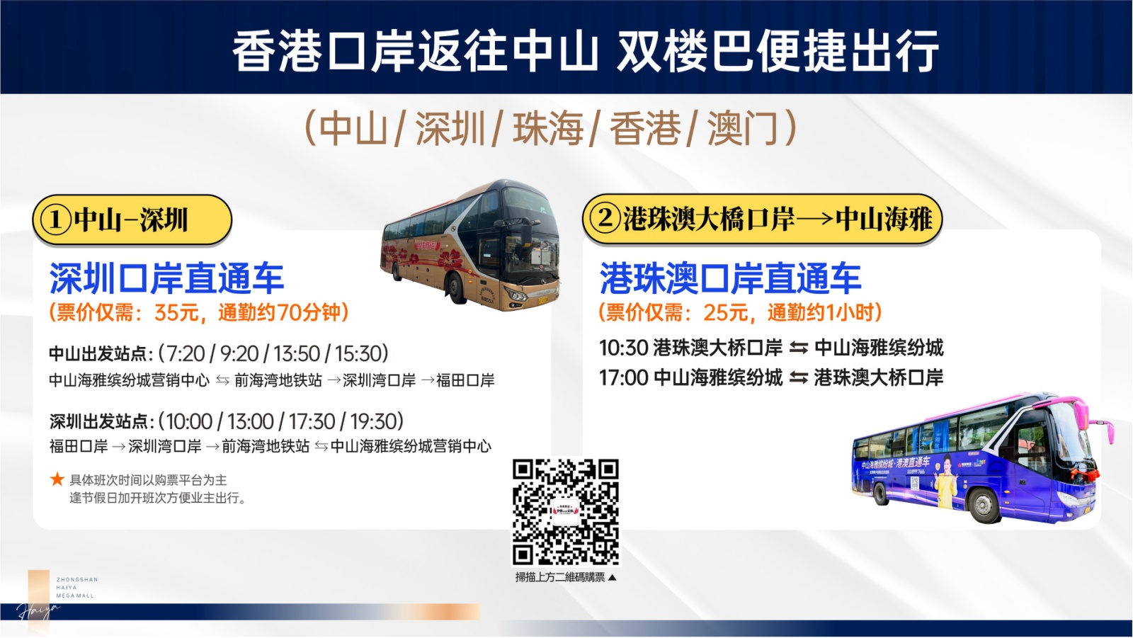 重磅配套5:雙樓巴直達香港 海雅業主港珠澳直通巴 深圳口岸專線巴士 專案開通了直達珠海港珠澳大橋人工島關口的直通巴士,海雅業主下樓即可乘坐,便捷往返中山和香港、澳門。