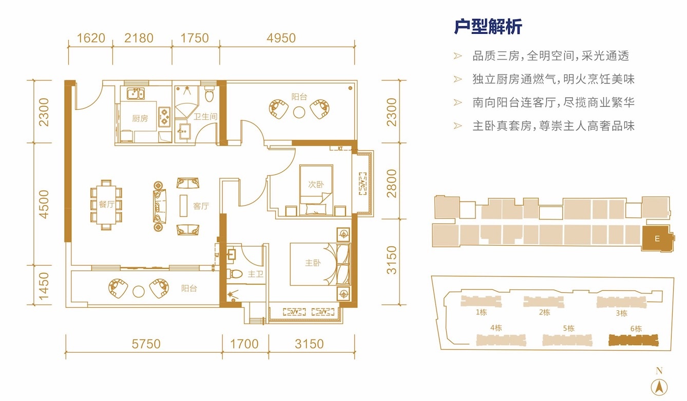 E戶型【舒闊三房】:建面約101㎡ N+1房2廳1衛全明空間,獨立廚房通燃火,明火烹飪