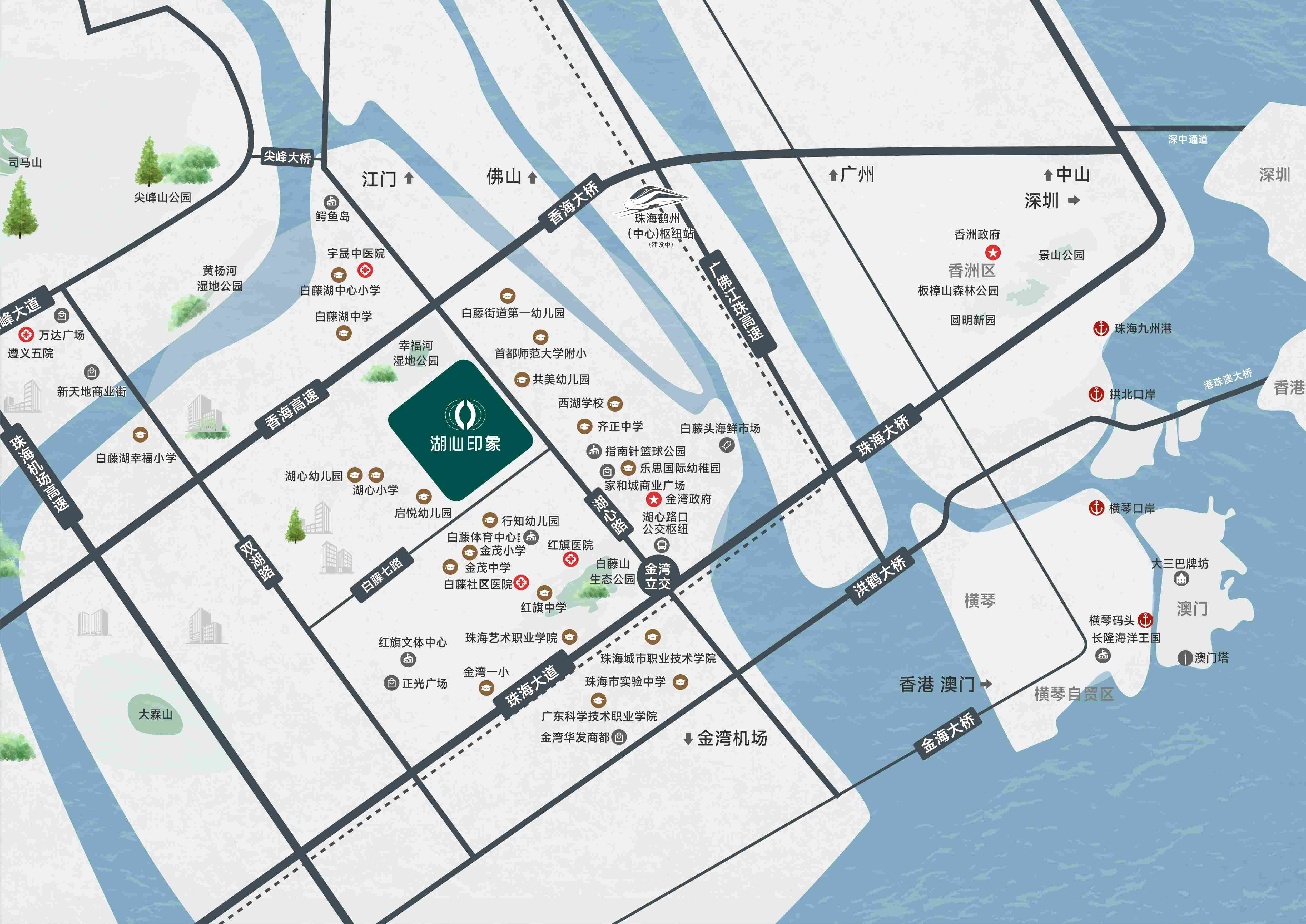 交通配套:一中軸、四橫四縱道路配套,海陸空軌道立體交通——15 分鐘直達香洲、1 小時粵港澳生活圈