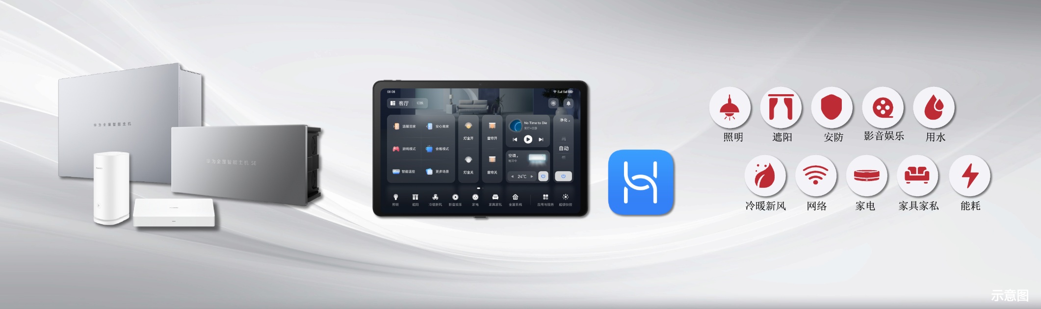 華為全屋智能1+2+N解決方案:1個智能主機,2種交互方式(智能中控屏、智慧生活APP),輕鬆控制N種全屋智能家電。
