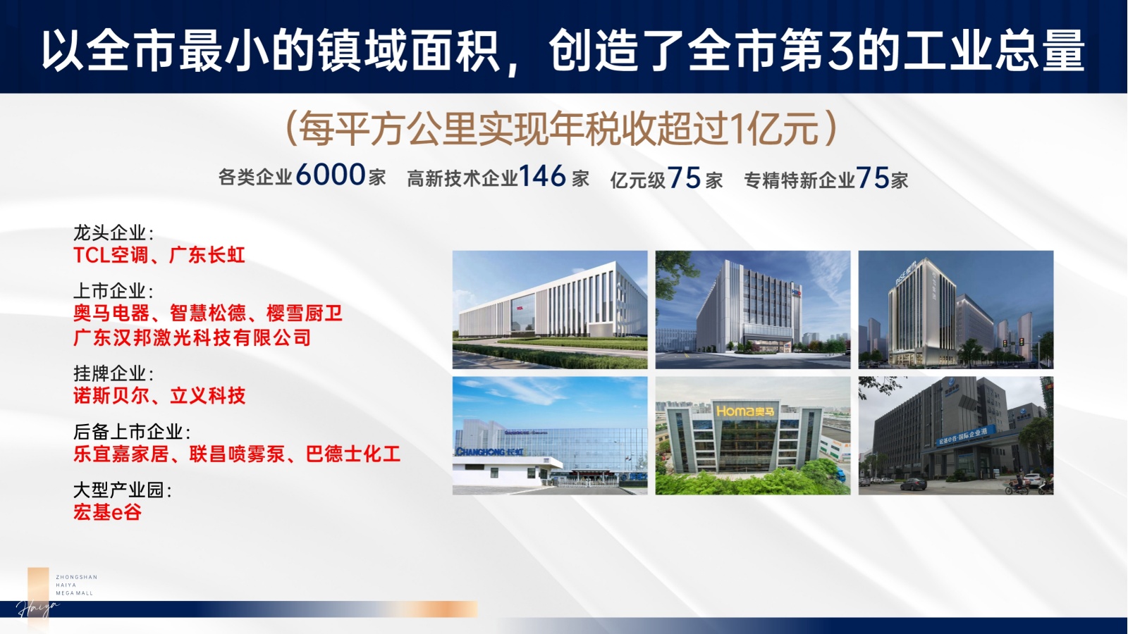 理由三:中山南頭:中國家電品牌基地 千億企業集群中山南頭是中國家電品牌基地,承接深圳西移產業資源,打造珠江西岸產業新中芯。南頭鎮產業經濟實力雄厚,經濟增速多年居全市前列,區域內聚集各類企業達6000家,其中高新企業146家,億元以上企業75家;雲集了以TCL空調、廣東長虹、奧馬冰箱、諾斯貝爾、阿裏雲等名企,產業集群引聚數十萬精英人群,消費市場潛力巨大。