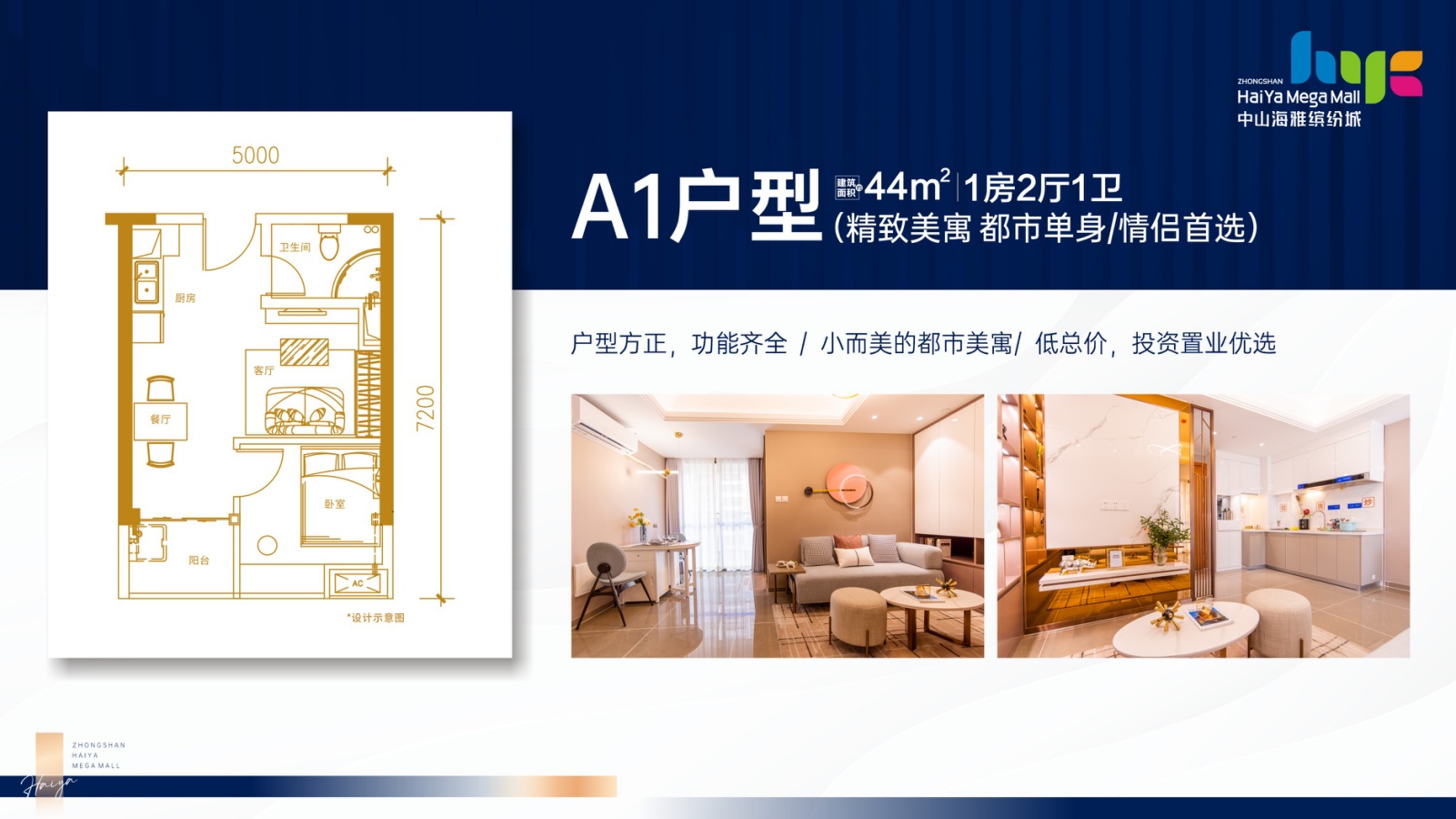在售產品實景展示:A1戶型【精緻一房】:建面約44㎡1房2廳1衛精緻小戶,五臟俱全,低總價首選