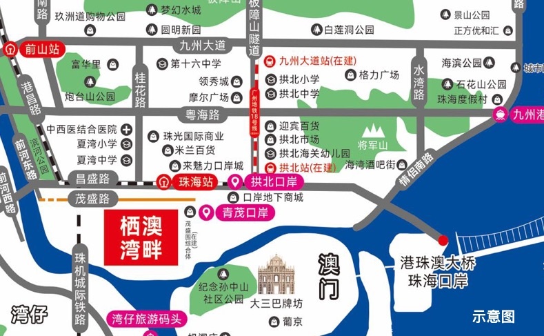 地鐵:在建的廣州地鐵18號線,專案臨近【拱北站】,沿途可達檸溪、香洲、唐家、中山、南沙等地,40-60分鐘可達廣州市區