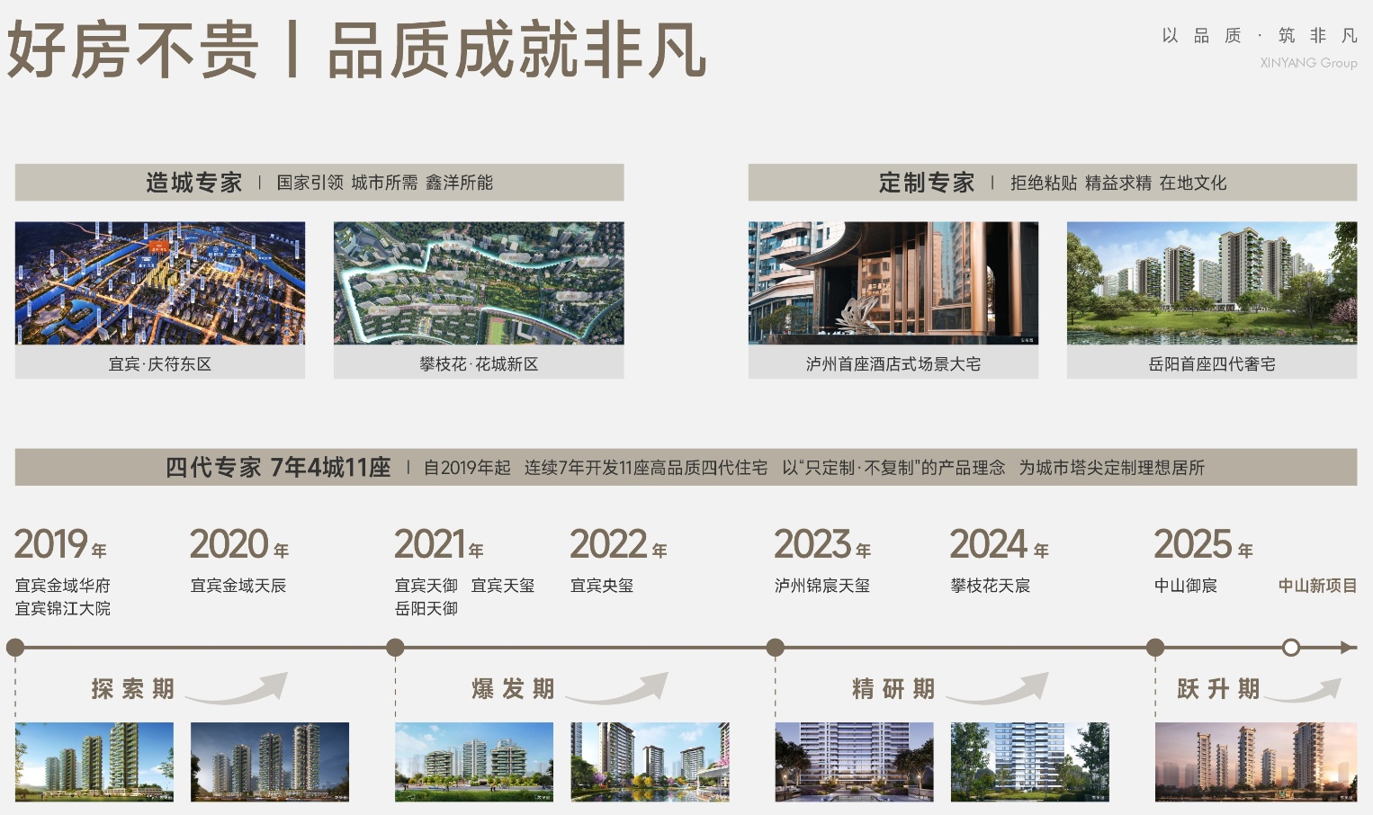 鑫洋集團,以“品質成就非凡”為品牌理念,以地產開發為核心,聚焦工程建設、生活服務、酒店管理、商業運營、服裝品牌管理等業務板塊。自2019年起 連續7年開發11座高品質四代住宅 以“只定制·不復制"的產品理念 為城市塔尖定制理想居所。