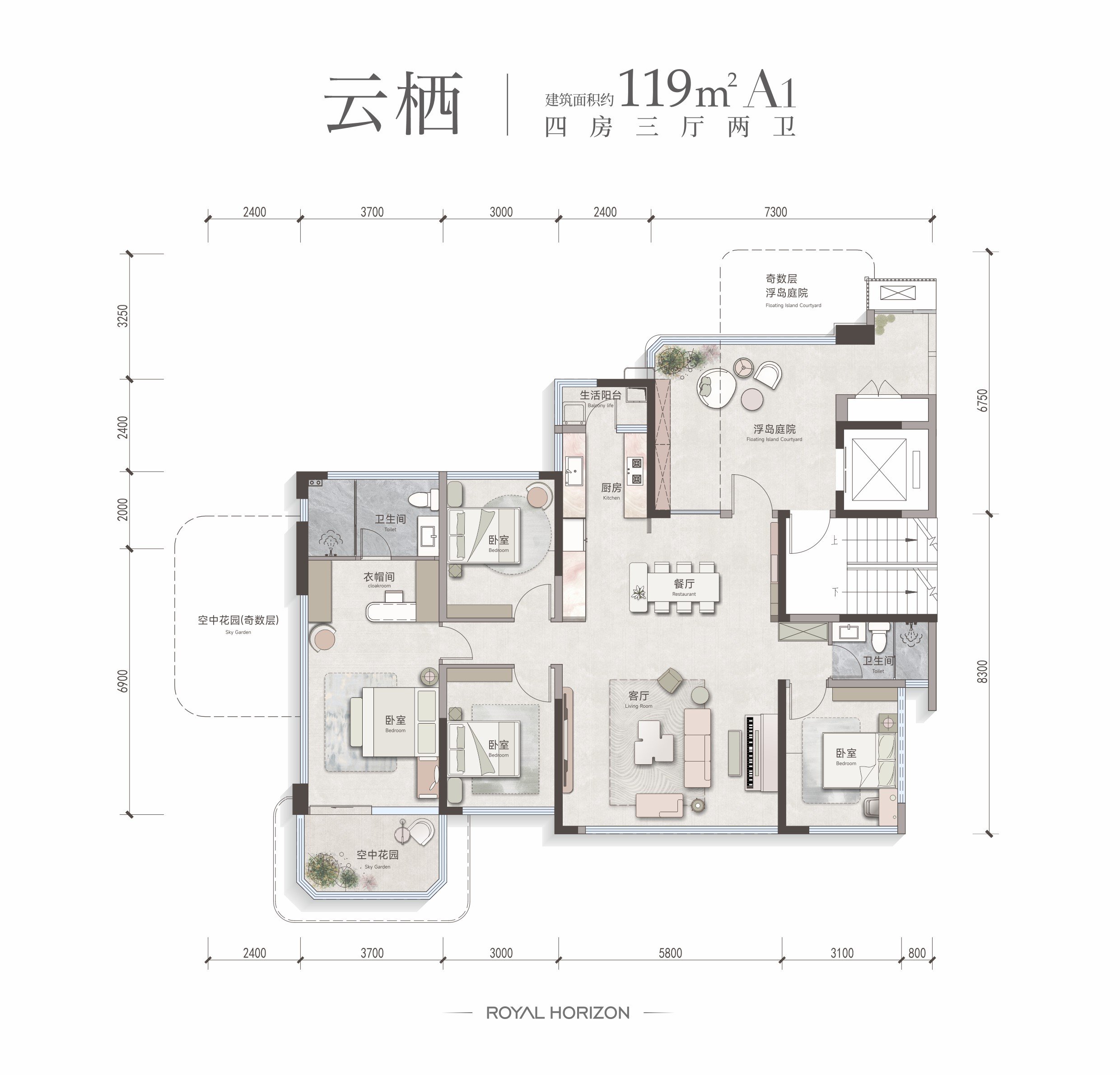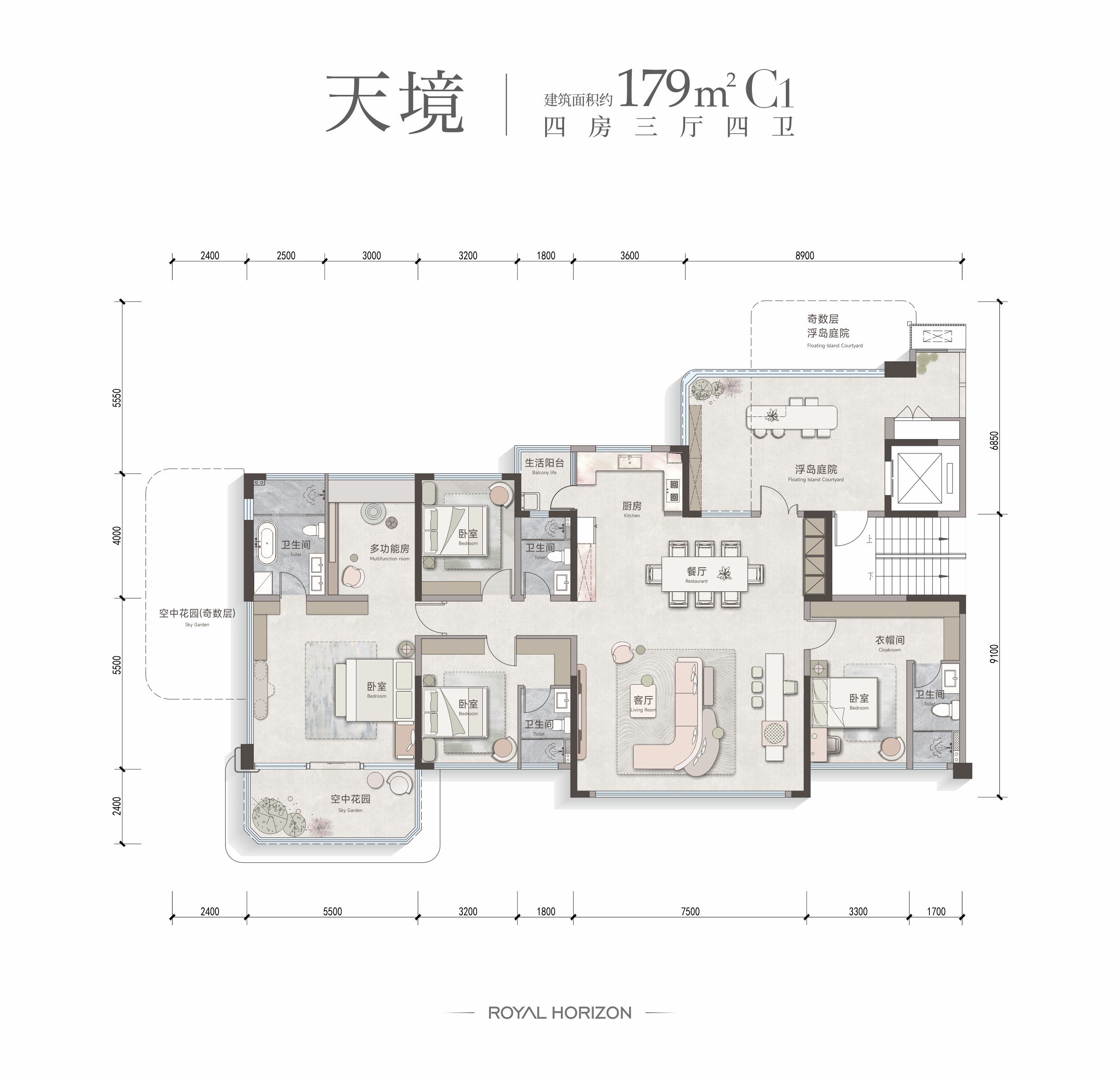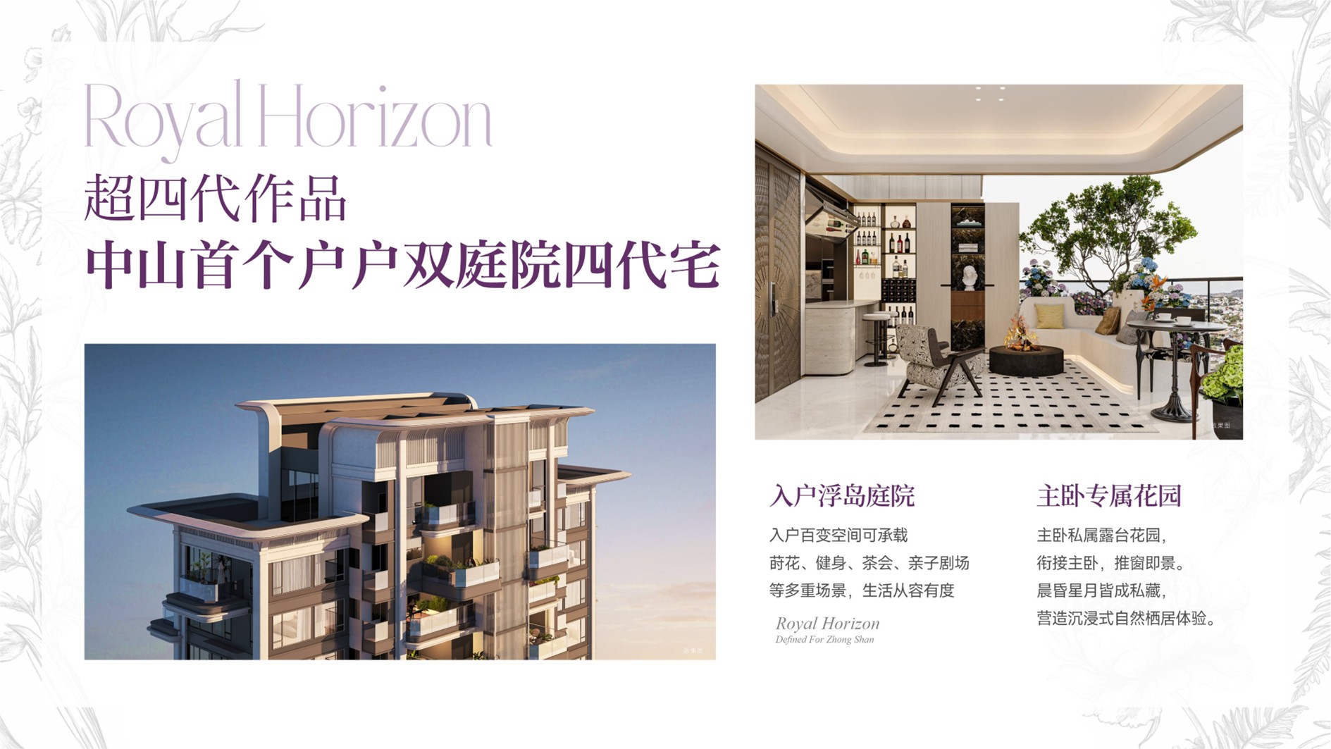 中山首例戶戶雙空中庭院社區 ,奇偶錯層立體構序設計,匠築至高約7米挑高庭院,奢享約145%極致得房率!標準層高臻至3.5米,入戶浮島花院銜加專屬空中花園,一梯一戶專梯尊享,著序中山首座酒店式超四代奢宅!